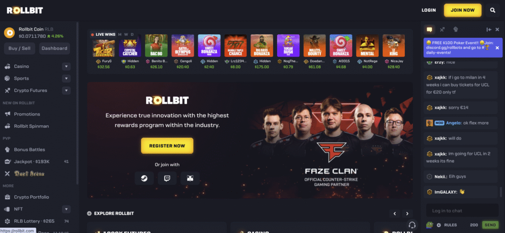 Rollbit, lancé en 2020, est l’un des crypto-casinos les plus atypiques du marché. Dès ses débuts, il s’est démarqué en introduisant des fonctionnalités inédites comme le trading de cryptos et de NFT directement intégré au casino, en plus des jeux classiques. C’est à la fois un casino, une plateforme de paris sportifs et un exchange crypto, ce qui le rend unique mais aussi controversé.